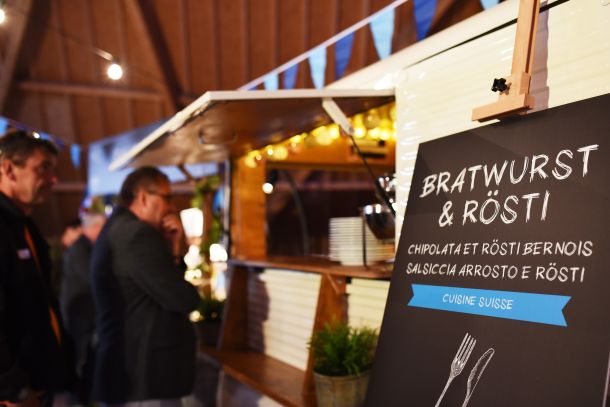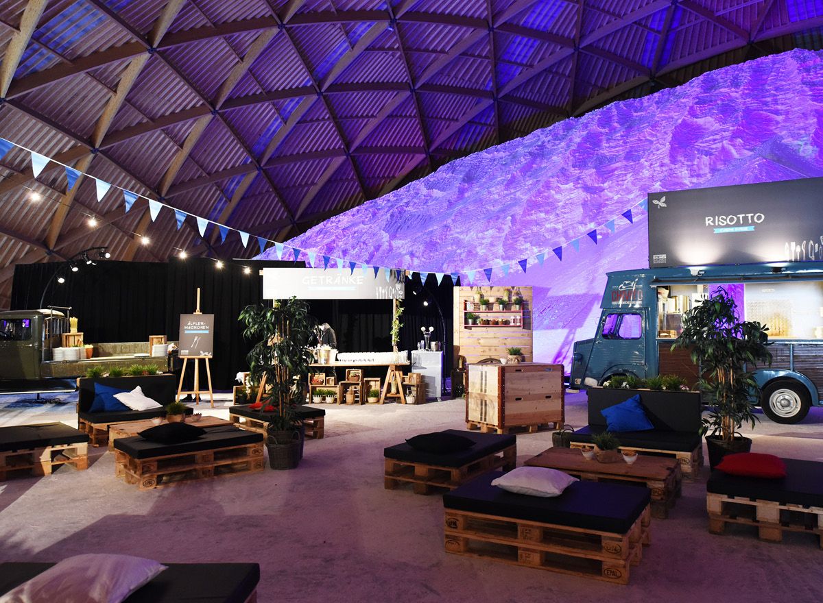 Der Saldome in Riburg ist am Eventtag für einmal nicht komplett durch den weissen Salzberg ausgefüllt, womit die Gäste freien Zugang zum Food Market hatten. Die Anwesenden erwarteten an verschiedenen Foodtruck- und Marktstand-Stationen diverse Schweizer Spezialitäten, u.a. aus dem Wallis, dem Tessin oder auch der Ostschweiz. Diese konnten an Stehtischen, sitzend in Lounges oder im grossen, "transparenten" Zelt genossen werden, welches den Blick auf den Salzberg erlaubte.