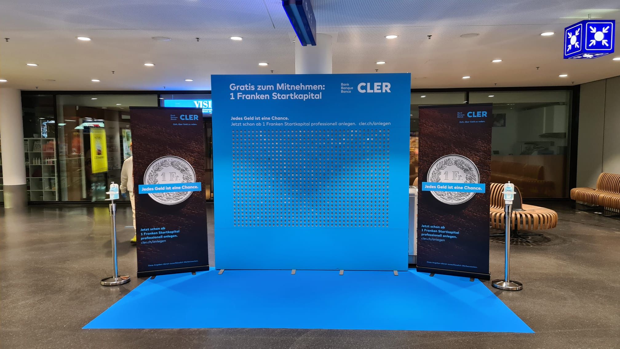 Mit einem Promotionsstand an verschiedenen Schweizer Bahnhöfen will man die hohe Frequenz an morgendlichen Pendlern nutzen, um auf das Anlageangebot der Bank Cler aufmerksam zu machen. Das Mittel zum Zweck ist eine eigens dafür produzierte Stellwand im Bank Cler Branding, welches mit 1'000 echten Einfranken-Stücken versehen ist. Promotorinnen und Promotoren laden die Passanten dazu ein, sich an der Wand zu bedienen und erklären dabei gleichzeitig die einfachen Anlagemöglichkeiten von welchen Bank Cler Kunden, und solche die es noch werden wollen, profitieren können. Um die Botschaft den Kunden mit auf den Weg zu geben, sind die Einfranken-Stücke zusätzlich mit einem QR-Code und dem Logo des Kunden beklebt.